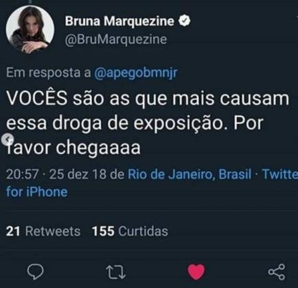 Em seguida, alguns fãs de Neymar criticaram Marquezine por conta da exposição, e ela respondeu através do Twitter: “VOCÊS são as que mais causam essa droga de exposição. Por favor, chega”.