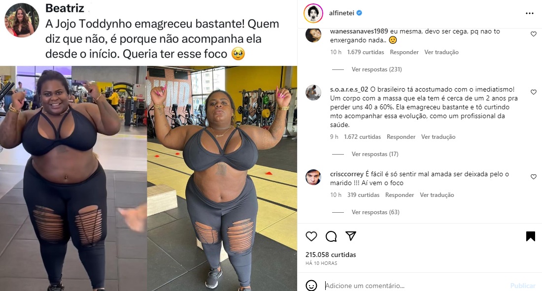 Outro, ainda, alertou que o brasileiro está acostumado com o imediatismo. Assim, explicou que um corpo com a massa que Jojo Todynho possui faz com que ela leve cerca de uns 2 anos pra perder uns 40 a 60%. “Ela emagreceu bastante e tô curtindo mto acompanhar essa evolução, como um profissional da saúde”, apontou.