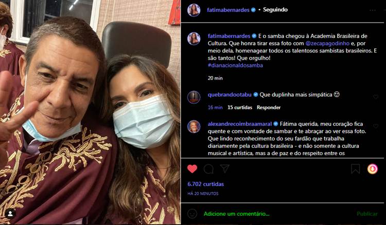 Na legenda, ele comemorou. “E o samba chegou à Academia Brasileira de Cultura. Que honra tirar essa foto com @zecapagodinho e, por meio dela, homenagear todos os talentosos sambistas brasileiros. E são tantos! Que orgulho! #dianacionaldosamba”, escreveu a apresentadora.