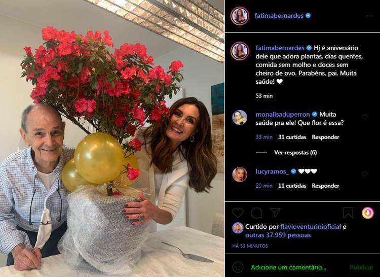 Os seguidores da apresentadora logo deixaram mensagem. “Muito lindos! Parabéns para o seu Amâncio, muitos anos de vida”, disse uma. “Parabéns senhor bernardes! ❤”, desejou outro. “Tem bom gosto seu pai. Linda azaleia. Parabéns ao seu pai. Muito saúde e alegria pra ele”, escreveu mais uma.
