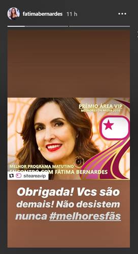 Em foto compartilhada na ferramenta stories de seu Instagram, Fátima comemorou o título no Prêmio Área VIP e mandou um recado para os fãs: “Vocês são demais“. Não desistem nunca”.
