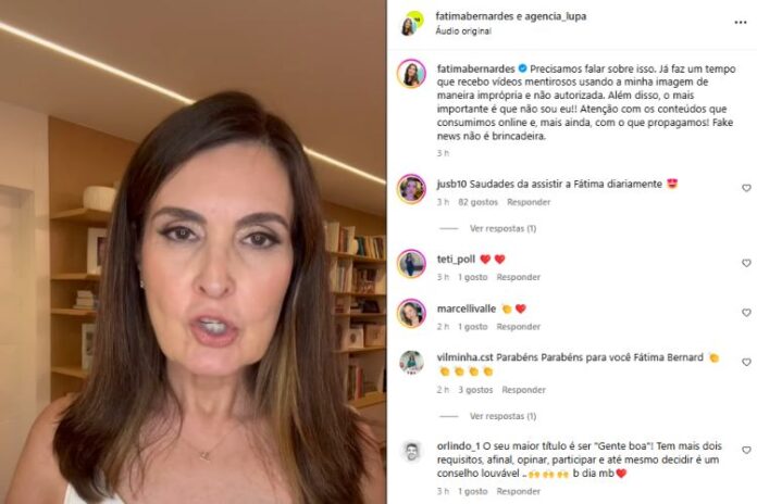 “Precisamos falar sobre isso. Já faz um tempo que recebo vídeos mentirosos usando a minha imagem de maneira imprópria e não autorizada. Além disso, o mais importante é que não sou eu! Atenção com os conteúdos que consumimos online e, mais ainda, com o que propagamos! Fake news não é brincadeira”, iniciou Fátima Bernardes, no Instagram.