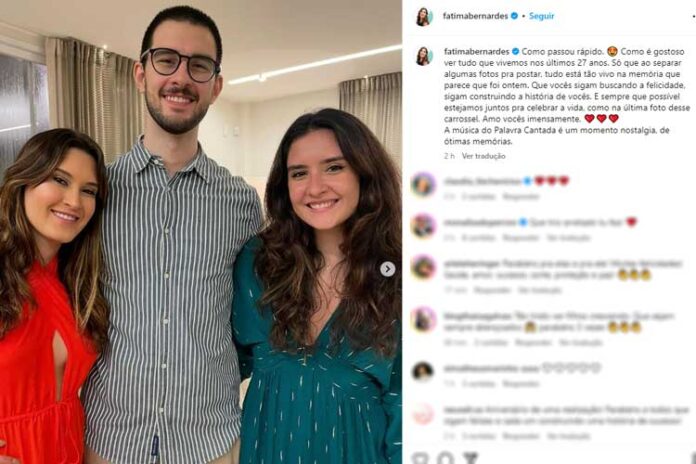 De acordo com Fátima, apesar de o tempo ter passado rápido, ela ainda guarda em sua memória registros especiais do dia do nascimento dos filhos. “Como passou rápido. Como é gostoso ver tudo o que vivemos nos últimos 27 anos. Só que, ao separar algumas fotos para postar, tudo está tão vivo na memória que parece que foi ontem. Que vocês sigam buscando a felicidade, sigam construindo a história de vocês”, declarou.
