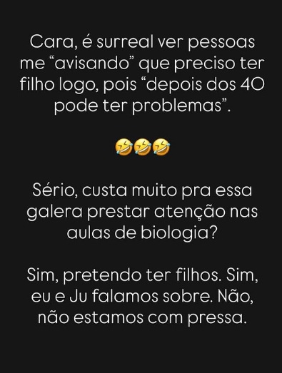 “Sério, custa muito para essa galera prestar atenção nas aulas de Biologia?”, disse o youtuber, que assumiu publicamente o namoro com Juliane Carvalho, de 23 anos, em novembro de 2023.
