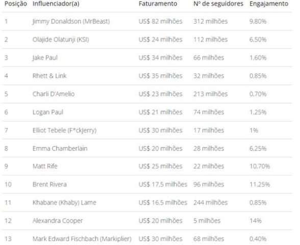 Dessa forma, de acordo com a revista Forbes, os maiores influenciadores do mundo são: Jimmy Donaldson (MrBeast), Olajide Olatunji (KSI), Jake Paul, Rhett & Link e em quinto lugar Charli D’Amelio. Vale lembrar que, a lista aponta os maiores influenciadores com engajamento e rendimento ao longo de todo o ano.