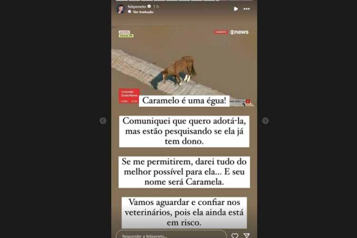 “Comuniquei que quero adotá-la, mas estão pesquisando se ela já tem dono. Se me permitirem, darei tudo do melhor possível para ela… E seu nome será Caramela”, afirmou. Segundo Felipe, a égua ainda está sendo acompanhada de perto pelos veterinários após ficar cerca de quatro dias sem se alimentar, presa em meio à enchente. “Vamos aguardar e confiar nos veterinários, pois ela ainda está em risco”, completou.
