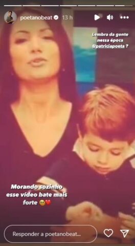 Dessa forma, por meio dos stories no Instagram, Felipe Poeta compartilhou o vídeo e na legenda dele, escreveu: “Lembra da gente nessa época @PatríciaPoeta?“, questionou ele, que ainda completou afirmando que quando lembra do momento, seu coração bate mais forte: “Morando sozinho esse vídeo bate mais forte“, destacou ele, usando emoji de coração para completar a postagem.