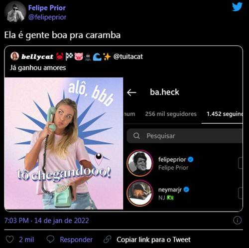 Porém, alguns internautas decidiram fazer um alerta para o arquiteto e disseram para ele tomar cuidado. Em seu perfil no Twitter, Prior elogiou a moça: “Ela é gente boa pra caramba”. Alguns seguidores de Felipe Prior não gostaram nada do ex-BBB elogiar Bárbara Heck, uma das confinadas do grupo pipoca do “BBB 22” no Twitter.