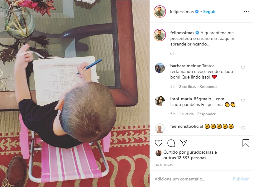 Na noite desta segunda-feira (8), Felipe compartilhou um clique muito fofo de seu filho Joaquim. Na foto o menino aparece estar estudando e o papai todo orgulhoso não conseguiu se conter e babou por esse instante tão especial na vida do pequeno. “A quarentena me presenteou o ensino e o Joaquim aprende brincando...”