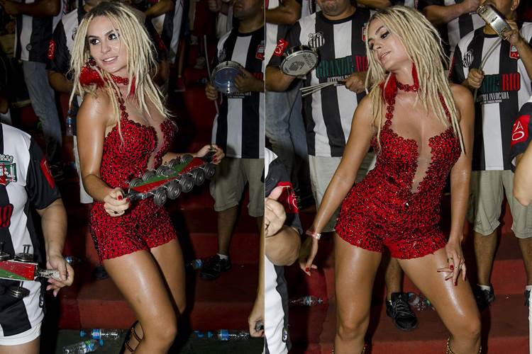 Vestindo um look super provocante, a loira, que é musa da escola de samba , esteve na quadra da agremiação para participar do ensaio técnico e comemorar junto à comunidade o aniversário do presidente de honra da escola, Jayder Soares.