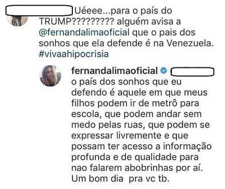 Fernanda não deixou barato e aproveitou para justificar sua mudança do país: “O país dos sonhos que eu defendo é aquele em que meus filhos podem ir de metrô para escola, que podem andar sem medo pelas ruas, que podem se expressar livremente e que possam ter acesso à informação profunda e de qualidade para não falarem abobrinhas por aí. Um bom dia pra você também”.