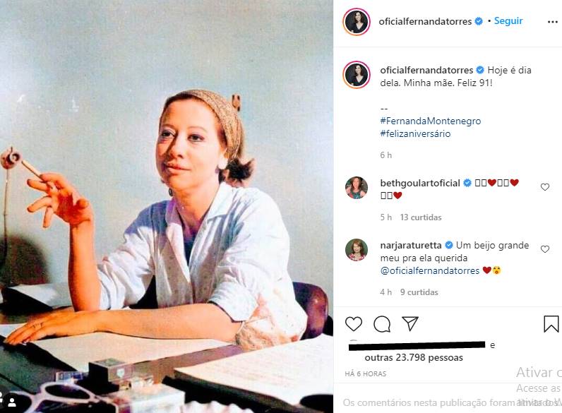 Se os fãs já morrem de orgulho dela, imagine quem faz parte da família. Para celebrar a data, a filha da atriz, Fernanda Torres, publicou uma foto antiga da mãe e parabenizou a aniversariante. “Hoje é dia dela. Minha mãe. Feliz 91!”, escreveu ela na legenda do post.