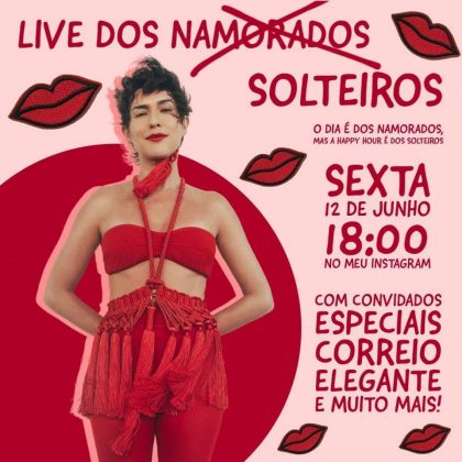 “Promessa é dívida… Solteiros, uni-vos!!! No dia dos namorados, 18h, bem afrontosos, vamos nos encontrar numa live delicinha por aqui? Já vai pensando nos drinks, dá um toque pro crush assistir tb e se declara nos comentários, coloca roupa bonita, diminui as luzes e vem comigo… Vai ser um date grupal virtual”, anunciou ela.