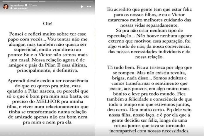 Fernanda explicou que refletiu muito antes de falar sobre o assunto com seus seguidores, pois não queria se alongar e demonstrar algo “superficial”. “Eu e o Victor não somos mais um casal. Nossa relação agora é de amigos e pais da Pilar. E essa última, principalmente, é definitiva”, afirmou.