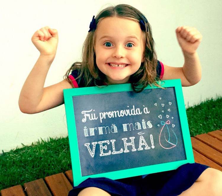 “Atenção pessoal! A Luisa vai realizar seu sonho de ter um(a) irmãozinho(a)! rsrs. Vou ser mamãe de novo! Ebaaa! Estamos super felizes com a novidade”, postando uma foto de Luisa segurando uma lousa escrita: “Fui promovida à irmã mais velha”.