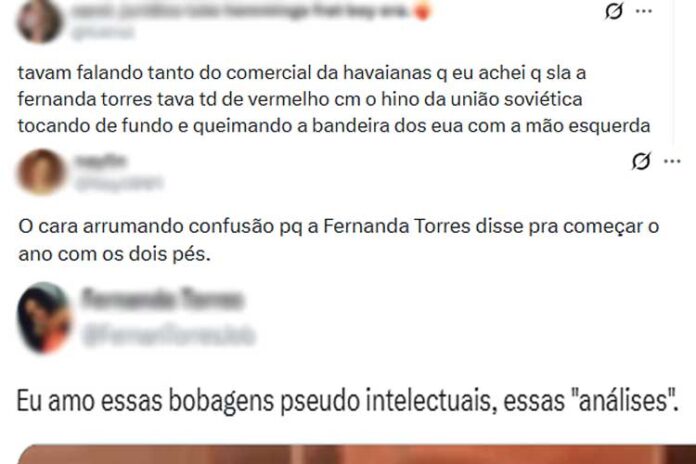 “O cara arrumando confusão porque Fernanda Torres disse para começar o ano com os dois pés”, reagiu outro. “Eu amo essas bobagens pseudo intelectuais, essas “análises’”, disse mais uma.