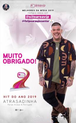 Felipe Araújo também comemorou a conquista em seu Instagram, compartilhando uma imagem para revelar o resultado aos fãs. O cantor ainda venceu na categoria ‘Sertanejo do Ano’. Hoje foi a vez de Ferrugem celebrar a vitória. “Muito obrigado”, escreveu o cantor.