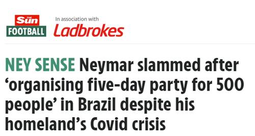 Neste domingo (27), a festa do atleta, que foi apelidada de ‘Neymarpalooza’, repercutiu na imprensa internacional. O jornal britânico The Sun noticiou que a comemoração acontece em um dos momentos mais críticos da pandemia do coronavírus no país.