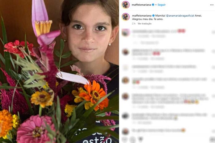 Mariana revelou que ganhou um arranjo de flores o fotografando ao lado da filha. “Mamita! Amei. Alegrou meu dia. Te amo”, declarou na legenda. Ana também está ajudando a filha a construir uma casa sustentável no interior de São Paulo. Toda a arquitetura foi pensada em conceitos de sustentabilidade.