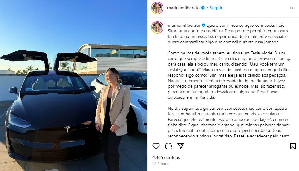 Ela falou do antigo carro e um episódio onde tentou minimizar a questão. “Como muitos de vocês sabem, eu tinha um Tesla Model 3, um carro que sempre admirei. Certo dia, enquanto levava uma amiga para casa, ela elogiou meu carro, dizendo: “Uau, você tem um Tesla! Que lindo!” Mas, em vez de aceitar o elogio com gratidão, respondi algo como: “Sim, mas ele já está caindo aos pedaços.” Naquele momento, senti a necessidade de me diminuir, talvez por medo de parecer arrogante ou esnobe. Mas, ao fazer isso, percebi que fui ingrata e desvalorizei algo que Deus havia colocado em minha vida”, pontuou.