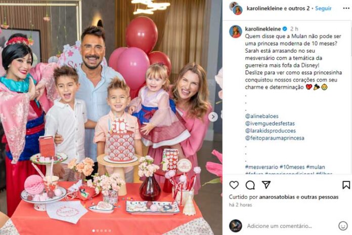 Na legenda, Karol explicou o motivo da escolha de Mulan como tema. “Quem disse que a Mulan não pode ser uma princesa moderna de 10 meses? Sarah está arrasando no seu mesversário com a temática da guerreira mais fofa da Disney! Deslize para ver como essa princesinha conquistou nossos corações com seu charme e determinação”, afirmou.