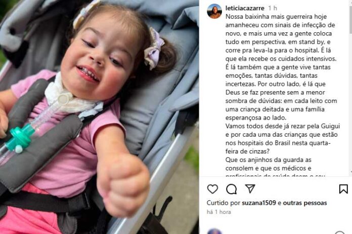 Letícia Cazarré ainda pediu aos seguidores orações pela melhora da filha e de todos aqueles que estejam passando por situações parecidas. “Vamos todos desde já rezar pela Guigui e por cada uma das crianças que estão nos hospitais do Brasil nesta quarta-feira de cinzas?”, pediu.