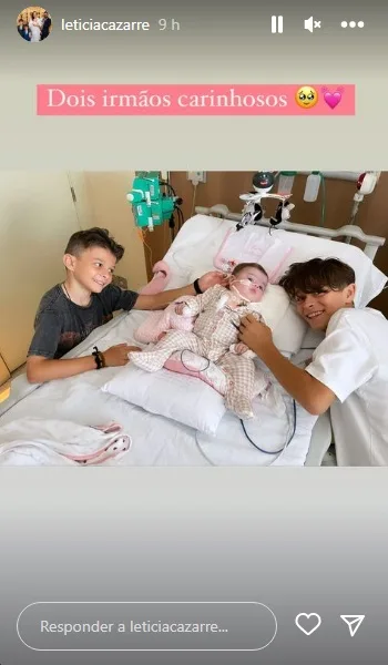 Nos stories do Instagram, Letícia compartilhou os momentos dos irmãos mais velhos ao lado da caçulinha da família. “O irmão mais velho apaixonado”, escreveu Leticia em um dos stories que publicou em seu perfil oficial no Instagram. “Dois irmãos carinhosos”, escreveu ela no post story seguinte, onde os outros dois filhos do casal apareciam ao lado de Maria.