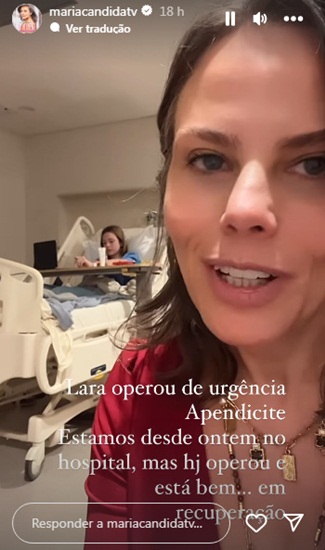 Em seguida, Maria Cândida deu detalhes do diagnóstico da filha. “Lara operou de urgência, apendicite. Estamos desde ontem no hospital, mas hoje operou e está bem… Em recuperação”.
