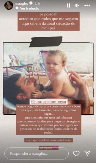 No feed da rede social, Isabella publicou registros da infância ao lado do pai e continuou o pedido de ajuda. “Dia 02/09/2023 minha vida mudou de uma maneira que jamais alguém imaginaria. Sou muito grata a todos os milagres que aconteceram, meu pai está vivo e se recuperando pouco a pouco, no tempo dele”, começou na legenda.
