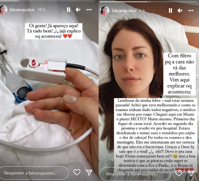 “Com filtro porque a cara não está das melhores. Vim aqui explicar o que aconteceu. Lembram da minha febre mais mal-estar semana passada? Achei que estava melhorando e, como os exames tinham dado todos negativos, o médico me liberou para viajar. Cheguei aqui em Miami e piorei muito! Muito mesmo”, escreveu Fabiana Justus por meio de uma postagem nos stories do seu Instagram.