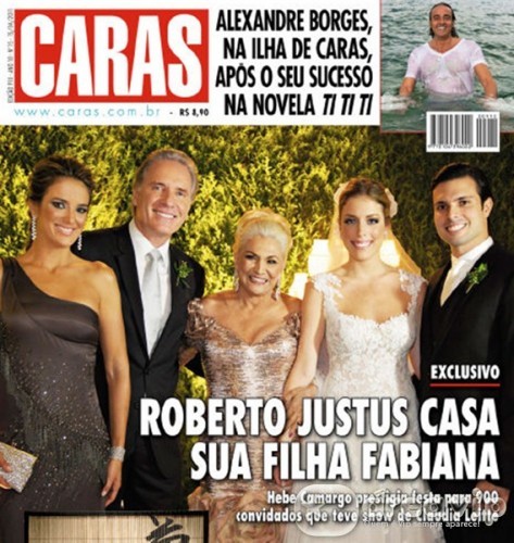 A filha de Roberto Justus, Fabiana Justus se casou com Bruno D’ancona, no Hotel Unique, em São Paulo, na noite de sábado (9). Além de sua esposa, Ticiane Pinheiro, Justus recebeu no casamento da filha, alguns famosos como Hebe Camargo, Ricardo Almeida, Afonso Nigro, entre outros. A revista Caras desta semana traz fotos e a reportagem sobre o casório. Os noivos receberam 900 convidados que contaram com um show de Claudia Leitte. A filha de Justus com Tici, Rafaella (1 ano e 8 meses), estreou como daminha de honra.