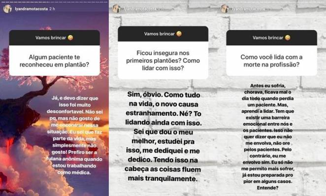 Ela também revelou se ficou insegura em seus primeiros plantões: “Sim, óbvio. Como tudo na vida, o novo causa estranhamento. Né? To lidando ainda com isso. Sei que dou o meu melhor, estudei pra isso, me dediquei e me dedico. Tendo isso na cabeça as coisas fluem mais tranquilamente”, explicou ela.