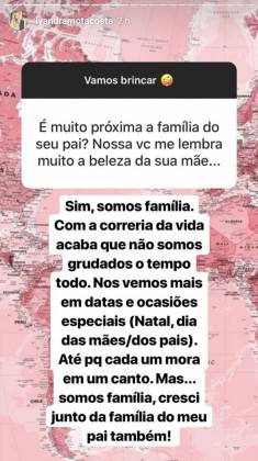 Por último, Lyandra falou de sua relação com a família de seu pai: “Sim, somos família. Com a correria da vida acaba que não somos grudados o tempo todo. Nos vemos mais em datas e ocasiões especiais (Natal, dia das mães/dos pais). Até porque casa um mora em um canto. Mas … somos família, cresci junto da família do meu pai também!”, finalizou ela.