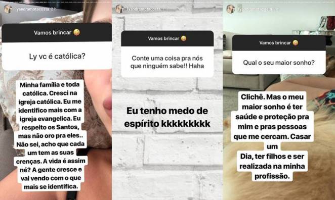 Lyandra foi questionada se era católica: “Minha família é toda católica. Cresci na igreja católica. Eu me identifico mais com a igreja evangélica. Eu respeito os Santos, mas não oro pra eles … Não sei, acho que cada um tem as suas crenças. A vida é assim né? A gente cresce e vai vendo com o que mais se identifica”, revelou ela. Em seguida ela conta, que seu maior medo é de espíritos.