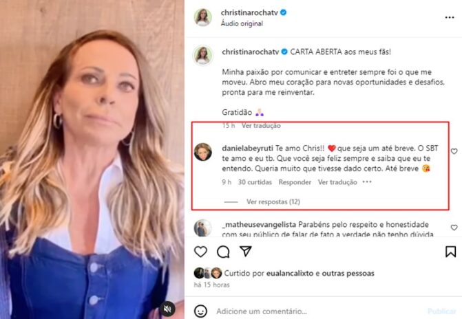 “Minha paixão por comunicar e entreter sempre foi o que me moveu. Abro meu coração para novas oportunidades e desafios, pronta para me reinventar. Gratidão“, legendou ela, ao publicar seu vídeo no Instagram. Nos comentários, Dani reagiu: “Te amo Chris!! Que seja um até breve“, iniciou ela.