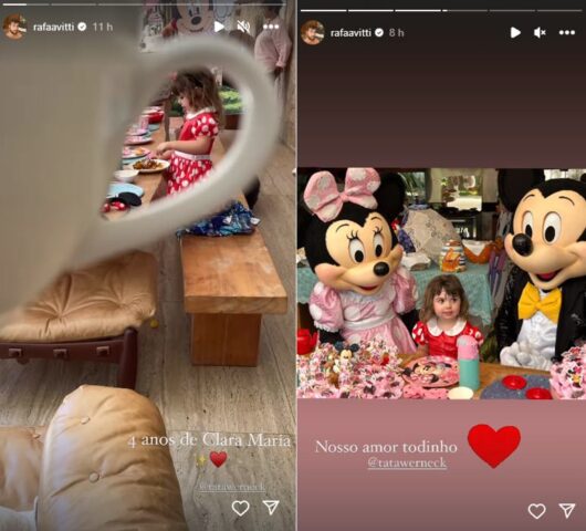 Já Rafael Vitti, o pai da menina, resolveu compartilhar em seus Stories o ‘Café da manhã da Caca’ que teve como inspiração a personagem Minnie. Nas imagens, a filha do artista aparece comemorando o aniversário comendo em um ambiente decorado com imagens da personagem da Disney. Posteriormente, ele também compartilhou mais um momento onde a pequena está ao lado de Mickey e Minnie e fez com que a web se derretesse com tanta fofura. Confira algumas imagens abaixo!