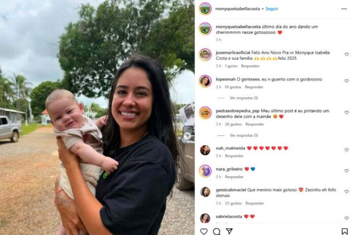 “Que menino mais gotoso. Zezinho é fofo demais”, afirmou a primeira. “Gostoso. Vontade de apertar ele”, elogiou a segunda. “Feliz ano novo para você Monyque Isabella Costa e sua família. Feliz 2025”, afirmou o terceiro. “Neném delícia! Jesus a sua vida sempre!”, expressou a quarta. “Lindos demais”, enalteceu a quinta.