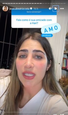 “Fala como é sua relação com a Hari”, indagou a pessoa, que não teve a identidade revelada por Jéssica. A jovem famosa começou expressando sua admiração pela cunhada e comentou sobre a personalidade delas: “Eu amo muito ela. Não é que a gente é parecida, mas acho que a gente tem uma vibe parecida. Ela é uma pessoa muito incrível, gostou muito dela. Tipo, muito”, começou.