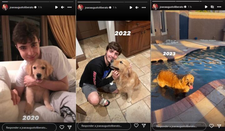 Foi através de sua conta oficial do Instagram Stories que João publicou três fotos e chamou a atenção de seus seguidores. Na situação, o filho de Gugu aparece com o seu cachorrinho sentado em um sofá, no ano de 2020, onde animal era praticamente um filhote. Dois anos depois, Augusto aparece novamente com seu pet e expõe o quanto ele cresceu. Em uma terceira imagem, o rapaz também mostra o bichinho em uma piscina. Confira abaixo!