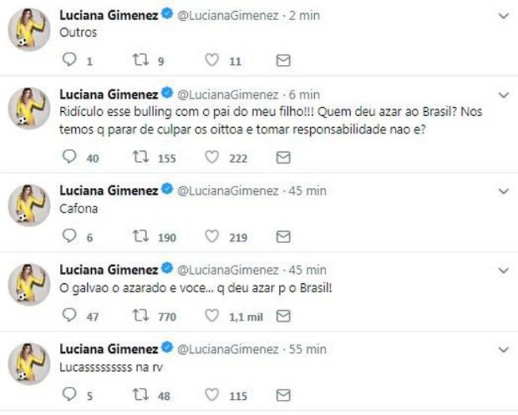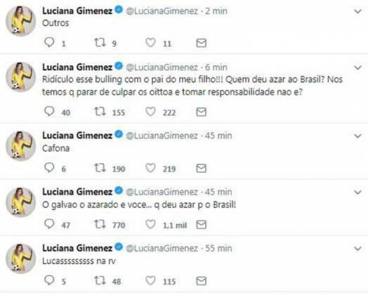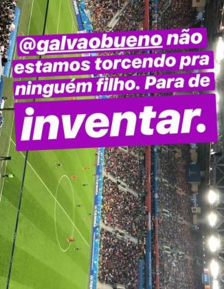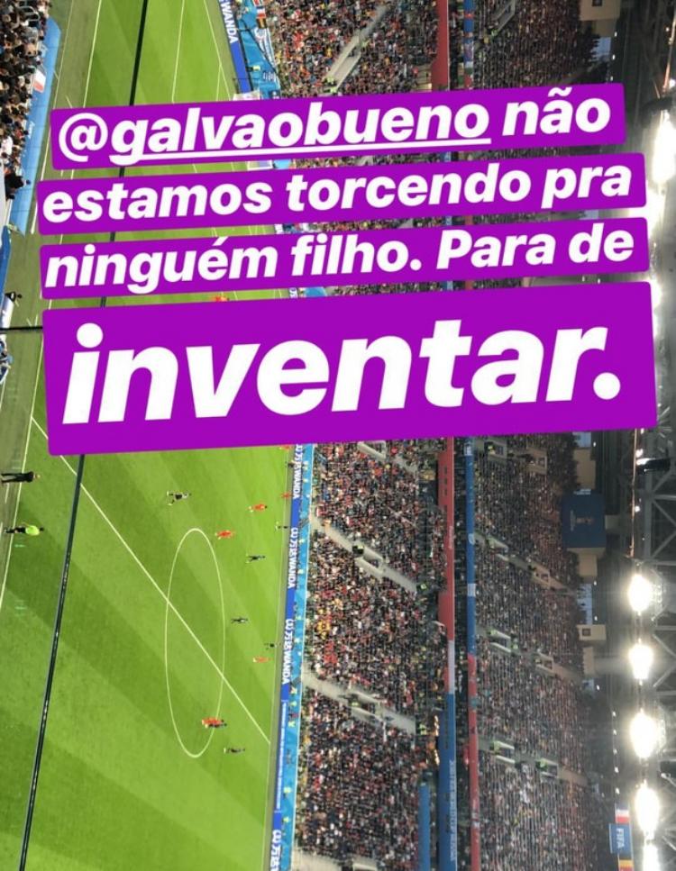“Não estamos torcendo pra ninguém, filho. Para de inventar”, escreveu ele, em uma foto onde exibe o estádio. Quem também não gostou da brincadeira de Galvão, foi a apresentadora Luciana Gimenez: “Ridículo esse bullying com o pai do meu filho. Quem deu azar ao Brasil? Nós temos que parar de culpar os outros e tomar responsabilidade, não é?“, comentou ela, que ainda chamou o mesmo de “cafona”. “Ô, Galvão, o azarado é você, que deu azar para o Brasil“.