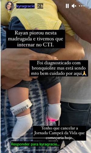 A mulher do ator, Kyra Gracie, usou as redes sociais para atualizar os seguidores sobre o estado de saúde do filho. “Rayan piorou nesta madrugada e tivemos que internar no CTI”, disse.