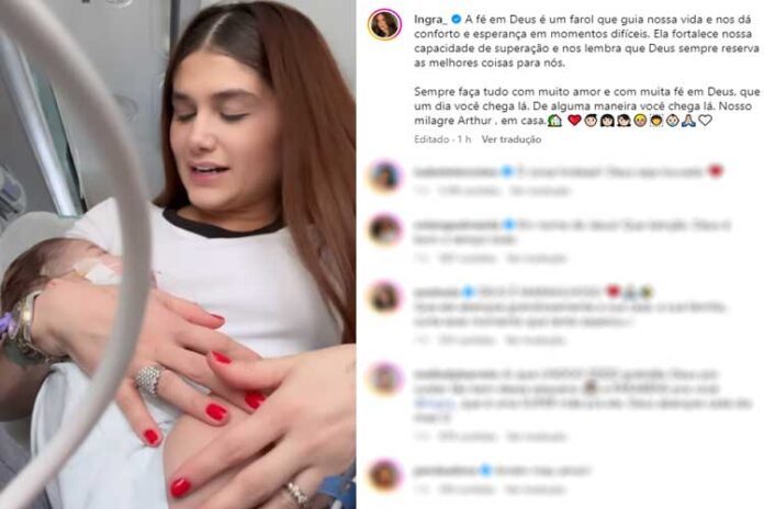 Ingra Soares, esposa de Zé Vaqueiro, utilizou seu perfil no Instagram nesta quinta-feira (16) para anunciar que o filho, Arthur, recebeu alta hospitalar após ficar internado por 9 meses na UTI neonatal.