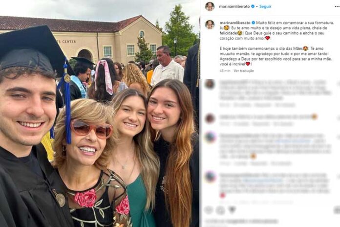 “Muito feliz em comemorar a sua formatura, Ju! Te amo muito e te desejo uma vida plena, cheia de felicidade. Que Deus guie o seu caminho e encha o seu coração com muito amor”, disse Marina, celebrando ainda o Dia das Mães.