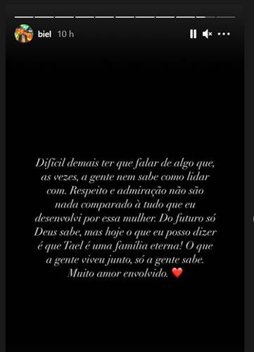 Biel também se pronunciou em seu Instagram: “Difícil demais ter que falar de algo que, ás vezes, a gente nem sabe como lidar. Respeito e admiração não são nada comparado a tudo que eu desenvolvi por essa mulher. Do futuro só Deus sabe, mas hoje o que eu posso dizer é que Tael é uma família eterna! O que a gente viveu junto, só a gente sabe. Muito amor envolvido”.