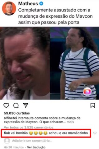 Diante da situação, mais do que inesperada, o cantor reagiu a um post sobre a reação de Maycon ao deixar o BBB24 após se tornar o primeiro eliminado do game com apenas quatro dias no ar. “Vai bonitão [emojis de risadas] achou que era mamãozinho“, debochou ele.