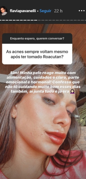“Minha pele reage muito com alimentação, cuidados e claro, parte emocional e hormonal. Confesso que não tô cuidando muito bem esses dias também, aí junta tudo e já era”, disse a atriz.