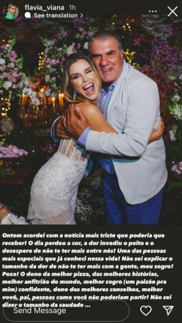 Dessa forma, por meio de publicações nos stories do Instagram, Flávia Viana relatou a terrível perda, chegando a afirmar que ‘o dia perdeu a cor’. “Ontem acordei com a notícia mais triste que poderia receber! O dia perdeu a cor, a dor invadiu o peito e o desespero de não te ter mais entre nós! Uma das pessoas mais especiais que já conheci nessa vida! Não sei explicar o tamanho da dor de não te ter mais com a gente, meu sogro! Poxa! O dono da melhor pizza, das melhores histórias, melhor anfitrião do mundo, melhor sogro (um paizão pra mim), confidente, dono dos melhores conselhos, melhor vovô, pai. Pessoas como você não poderiam partir! Não sei dizer o tamanho da saudade…”, começou.