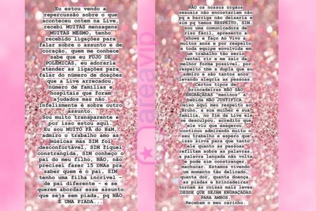 “Sou muito fã do Bruno e Marrone, admiro o trabalho, amo as músicas mas SIM foi desconfortável, SIM fiquei constrangida, SIM conheço o pai do meu filho. NÃO, não precisei fazer 15 DNAs pra saber quem é o pai. Sim, tenho uma família incrível – do pai diferente – e se querem abordar esse assunto que seja sem piada, porque não é uma piada”, destacou. “Deixo aqui meu respeito ao Bruno, a sua mulher e sua família, no fim da live ele me desculpou, acredito que ele viu que exagerou”, pontuou.