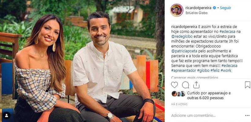 Ricardo também fez um agradecimento a jornalista que esteve com ele nesta manhã. “Obrigado Patricia Poeta pelo acolhimento e parceria e a toda esta equipe fantástica que faz este programa tem tanto tempo!!! Semana que vem tem mais!!! #edecasa#apresentador #globo #feliz #work”, escreveu o ator no Instagram.