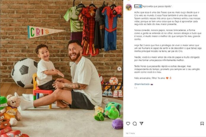 ““Aproveita que passa rápido”. Acho que essa é uma das frases que eu mais ouço desde que o Cris veio ao mundo. E essa frase também é uma das que mais fazem sentido nesses três anos que o Neneco entrou nas nossas vidas, porque se tem uma coisa que eu faço é aproveitar cada segundo ao lado do meu maior presente“, iniciou Fred Bruno no feed do Instagram.